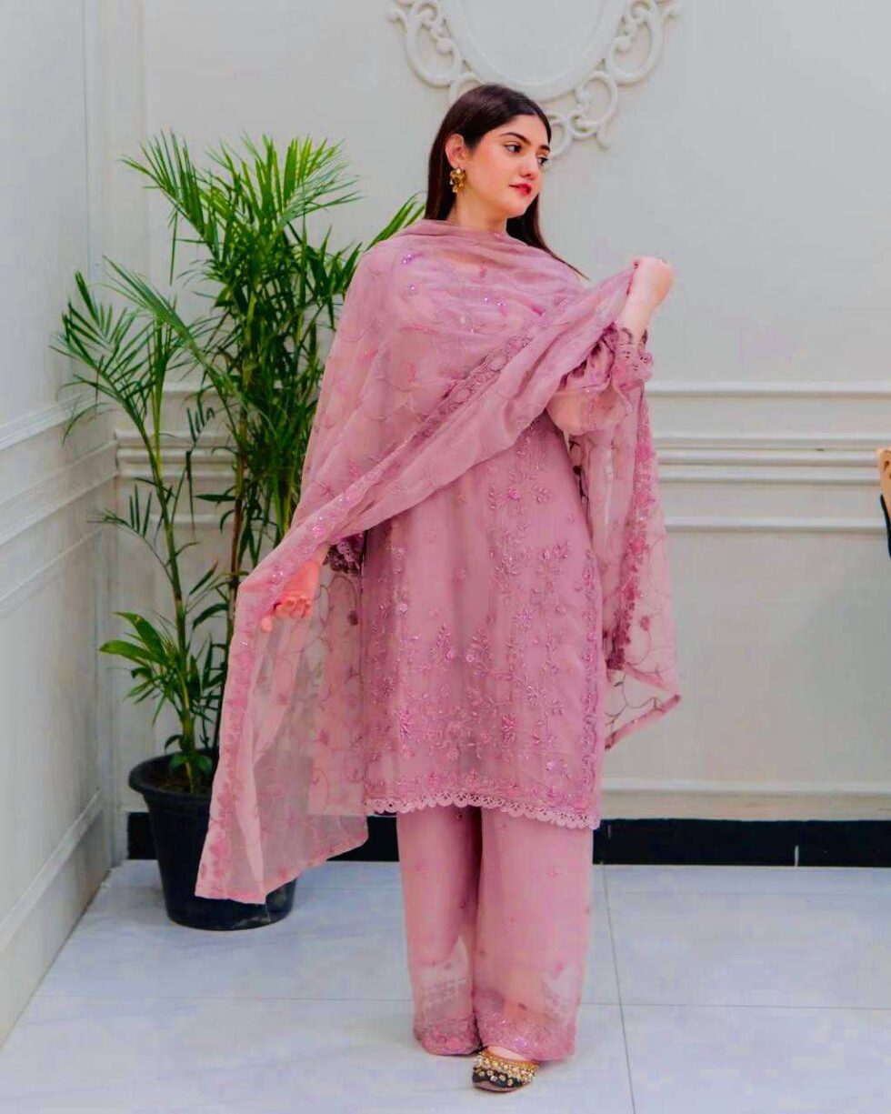 Women’s Faux Georgette Embroidery work Straight Kurti With Pant and Dupatta Set